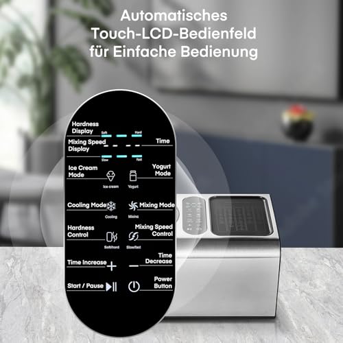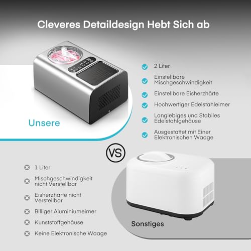𝐋𝐄𝐈𝐒𝐓𝐔𝐍𝐆𝐒𝐒𝐓𝐀𝐑𝐊: Mit 180 Watt Leistung kann die selbstkühlende Eismaschine 2L Speiseeis innerhalb von 30 Minuten herstellen. Der herrausnehmbare Behälter vereinfacht die Portionierung des fertigen Speiseeis