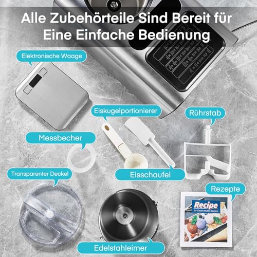 𝐋𝐈𝐄𝐅𝐄𝐑𝐔𝐌𝐅𝐀𝐍𝐆: Der Lieferumfang umfasst die Eismaschine(Maßen von 28 x 42,3 x 20,5 cm) mit Edelstahl-Eisbehälter, Eisportionierer, Deckel mit Einfüllöffnung, Messbecher und Spatel, ein Rezeptheft mit vielen Eisideen und eine elektronische Waage, mit welcher Sie Ihre Zutaten einwiegen können!