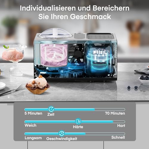 𝐄𝐈𝐒𝐊𝐑𝐄𝐀𝐓𝐈𝐎𝐍𝐄𝐍: Die kompakte Eismaschine kann in kürzester Zeit verschiedene Eisvariationen zubereiten. Ob Sorbet, Frozen Yoghurt oder Speiseeis, die Eismaschine produziert jede gewünschte Eisidee
