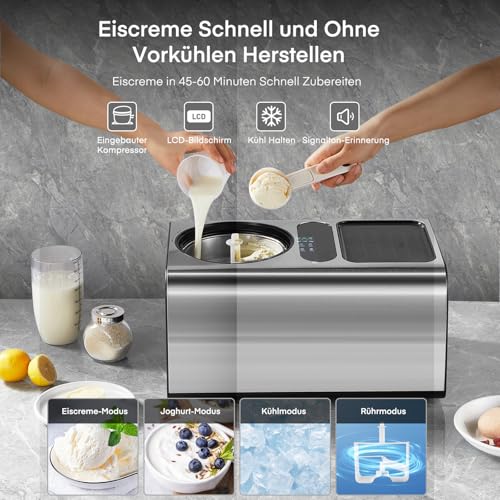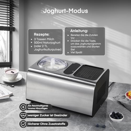 3-in-1 Eismaschine & Joghurtbereiter 2 L, 180 W Eiscrememaschine aus Edelstahl mit Kühl- u. Heizfunktion, hausgemachtes Speiseeis, Selbstkühlender Kompressor kein Vorfrieren, Eis/Joghurt/Gelato/Sorbet