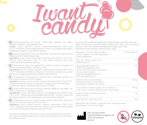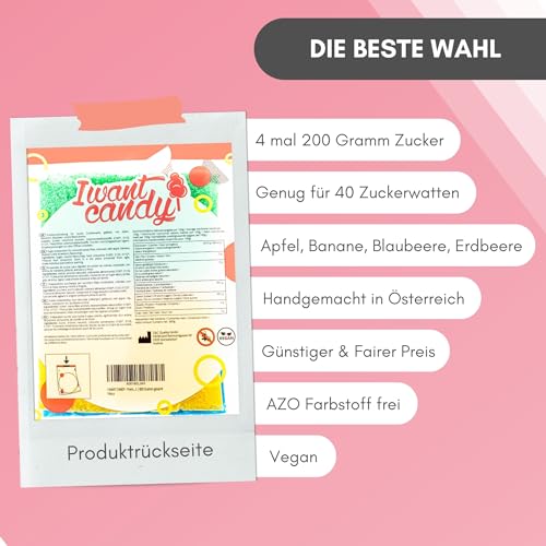 4x200g | AZO Frei | Natürliche Aromen | Apfel, Banane, Blaubeere, Erdbeere | Zucker für Zuckerwatte von I WANT CANDY®