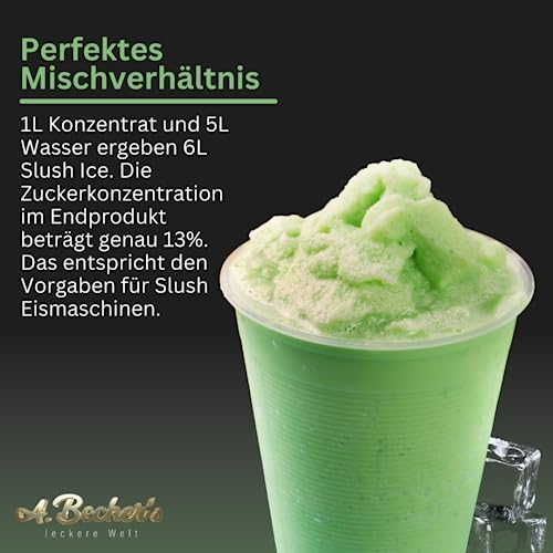 SIRUP FÜR PERFEKTES MISCHVERHÄLTNIS: 1L Konzentrat und 5L Wasser ergeben 6L Slush Ice. Die Zuckerkonzentration im Endprodukt beträgt kleinlich 13% (entspricht Vorgaben Anstelle Slush Eismaschinen).