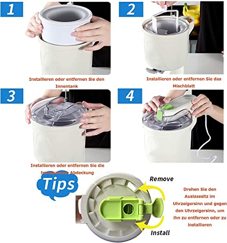 【Material】: Innenbehälter der Eismaschine sämtliche lebensmittelechtem Leichtmetall, antihaftbeschichtet, rostfrei, leicht zu reinigen, zu waschen und zu reinigen, gesund und harmlos.