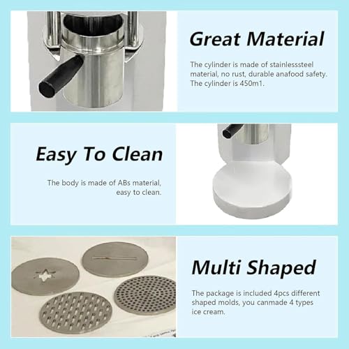 Formoptionen: Vier mitgelieferte Formen ermöglichen eine Vielzahl von Texturen und Designs, von zarten Bändern bis hin zu auffälligen Spiralen. Verschönern Sie Ihre Speisekarte in Cafés, Hotels oder Foodtrucks mit vielseitigem Eis und begeistern Sie Ihre Kunden.
