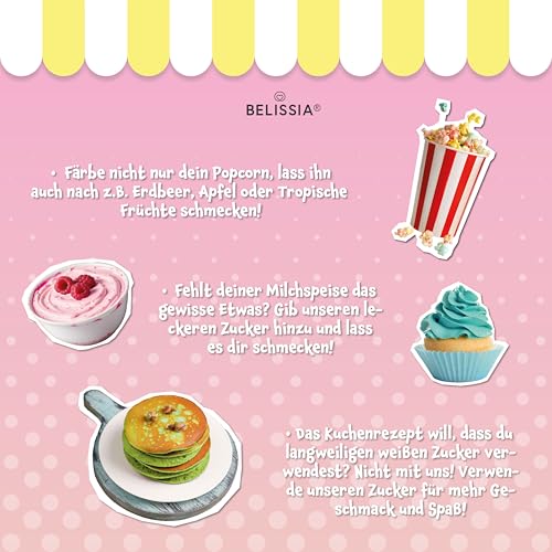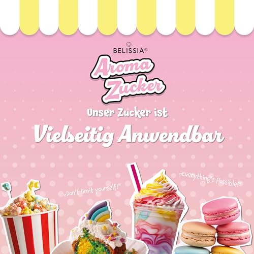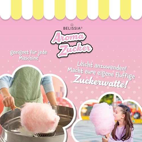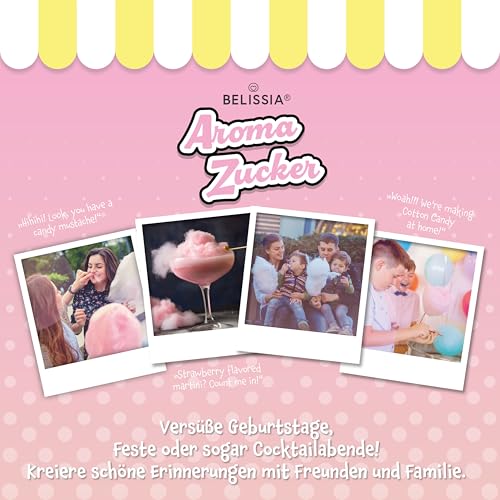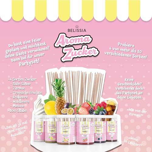 Belissia Aromazucker | 250g Zuckerwatte Zucker mit Partyset 6 x | Intensiver Aromazucker für jede Zuckerwattemaschine | Geeignet für Dessert, Popcorn, Slush, Cocktails uvm. | Inklusive 100 Stäbchen