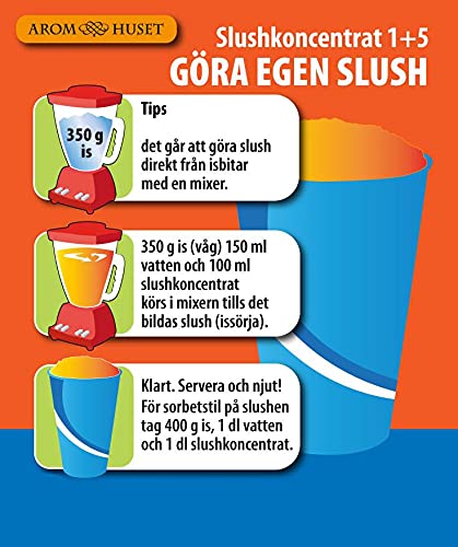 Anleitung: Verdünnen Sie 1 Teilbereich Konzentrat mit 5 Teilen Wasser und frieren Sie es in einer Slush-Maschine ein.