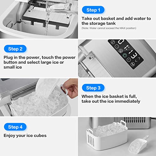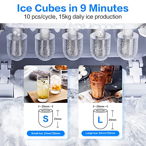 2 Verschiedene Eiswürfelgrößen : Sie können zwei verschiedene Größen von Eiswürfeln nach Ihren persönlichen Vorlieben Urteilsfindung. Drücken Sie einfach die Taste, um zwischen S und L zwei Größen auszuwählen. Fügen Sie einfach Wasser hinzu und schalten Sie den Strom ein, um den Betrieb zu starten. Alles funktioniert vollkommen automatisch und die Bedienung ist sehr einfach.