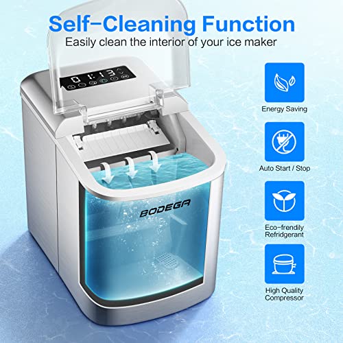 BODEGA Eiswürfelmaschine Edelstahl, 15 kg Eiswürfel pro Tag, Produktionszeit 9 min,Tragbarer Eiswürfelbereiter 2,1L…