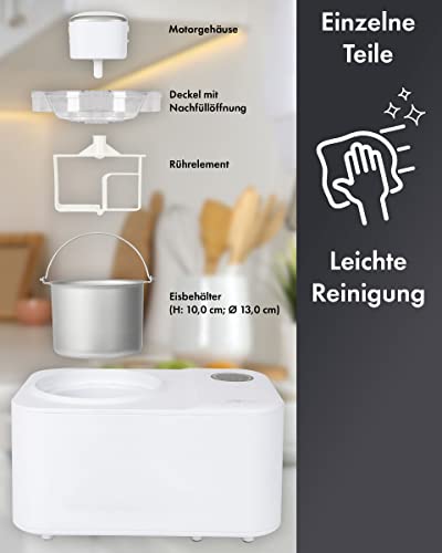Funktional – Rührelement und Motorgehäuse sind zur leichten Reinigung des Eisbehälter herausnehmbar – der transparenter Deckel besitzt eine Nachfüllöffnung, wodurch sich nachträglich Zutaten leicht hinzufügen lassen