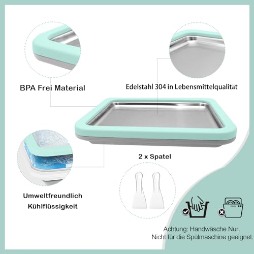 Materials in Lebensmittelqualität: Unsere Eisplatte besteht aus Edelstahl 304 in Lebensmittelqualität und sorgt für gesundes und geruchloses Eis oder gefrorenen Joghurt, den Sie sicher verzehren können. Die Eisplatte lässt sich leicht reinigen, sodass Sie sich keine Sorgen über Wäsche machen
