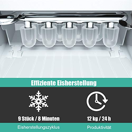 【Effizienter Eisbereiter】 Mit seinen schnellen und effizienten Funktionen braucht dieser portable Eiswürfelbereiter nur 8 Minuten, um 9 Stücke leckeres und kaubares, kugelförmiges Eis herzustellen, wodurch Ihnen Zeit gespart wird, in der Sie bereits schmackhaftes Essen oder Drinks zubereiten können. Um Ihnen genügend Eis zur Verfügung zu stellen, kann die Maschine 12 kg Eis am Tag produzieren.