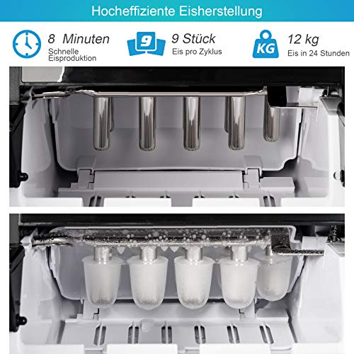 【Hervorragende Eiswürfel-Bereitungs-Kapazität】 Unser effizienter Eiswürfelbereiter kann 9 kaubare, leckere, kugelförmige, innen hohle Eiswürfel in 8 Minuten herstellen, sodass Sie nicht lange auf Ihr Eis warten müssen. Insgesamt kann er innerhalb von 24 Stunden bis zu 12 kg Eiswürfel produzieren, wodurch Ihr täglicher Bedarf an Eis gedeckt wird. Der 1,8 Liter Wassertank beinhaltet Genügend Wasser zur Eisherstellung, wobei der Eiswürfel Korb bis zu 0,8 kg Eis aufbewahren kann.