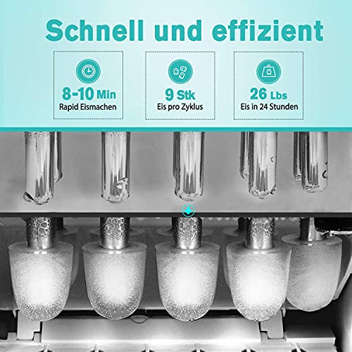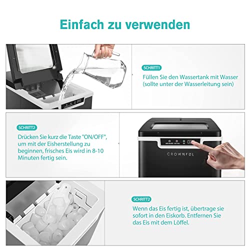 EFFIZIENTER EISMASCHINE: Der Crownful zumutbar Eismaschine verfügt über ein eingebautes 1,8L großes Reservoir und produziert bis zu 9 Stufe Eiswürfel in trotzdem 8-10 Minuten und bis zu 26lbs in 24 Stunden. Das geschmolzene Eiswasser wird von neuem in das Reservoir fließen und für die Eisherstellung verwendet werden. Es ist energiesparend und arbeitet effizient.