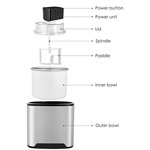 🍨 In 45 Minuten hergestellt : Stellen Sie zuerst die innere Schüssel einfach über Nacht (12-18 Stunden unter -18° C ) in den Gefrierschrank und Ihre Zutaten in den Kühlschrank. Sobald die Zutaten und den Behälter eingekühlt sind, stellen Sie Ihn in die Eismaschine, starten Sie das Triebwerk und gießen Sie dann Ihre Zutaten ein.Die Eismaschine kann in 45 Minuten Eis herstellen.