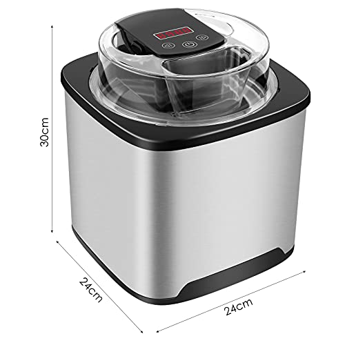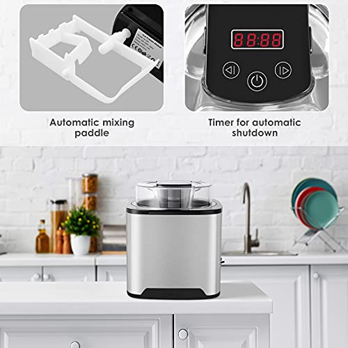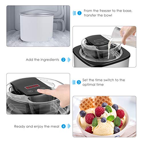 🍨 5-45 Min.Timer: Digitaler Timer mit automatischer Abschaltfunktion, variable Zeiteinstellung (5-45 Min. ) Normale Zubereitungszeit (Eiscreme): 20-45 Minuten. Verwenden Sie den digitalen Timer, um die Mischzeit von Eiscreme einzustellen und zu überwachen. Dies kann sein Es ist sehr praktisch, die Produktionszeit angebracht Ihren spezifischen Anforderungen einzustellen. Diese Eismaschine ist automatisch und stoppt automatisch, wenn der Timer allseitig ist.