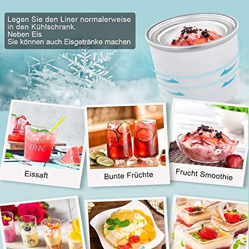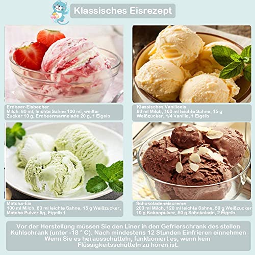 【Gefriertopf 1,5 l】 Der Gefriertopf hat eine doppelt isolierte Wand, die mit Flüssigkeit gefüllt ist, um sicherzustellen, dass Ihr Dessert gleichmäßig gefriert, kein Eis benötigt und eine ausreichende Kapazität garantiert, perfekt für 4-6 Personen. Der Gefrierschrank muss vor Gebrauch vollständig gefroren sein.