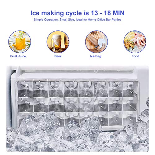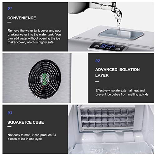 【Effiziente Eisbereiter】 Eiswürfelbereiter können dickere oder dünnere Würfel machen, indem Sie einfach die „-“ und „+“ Tasten für verschiedene Eisstärken drücken. Pro Zyklus werden 24 Würfel hergestellt, und jeder Zyklus dauert 12 bis 18 Minuten. Jedoch kann die Einfrierzeit mit dem Timer eingestellt werden, wenn gewünscht. Dies kann bis zu 18 kg Eiswürfel pro Tag produzieren, so dass es die Eisbedürfnisse einer Familie den ganzen Tag lang erfüllen kann, da neues Eis ständig produziert wird.
