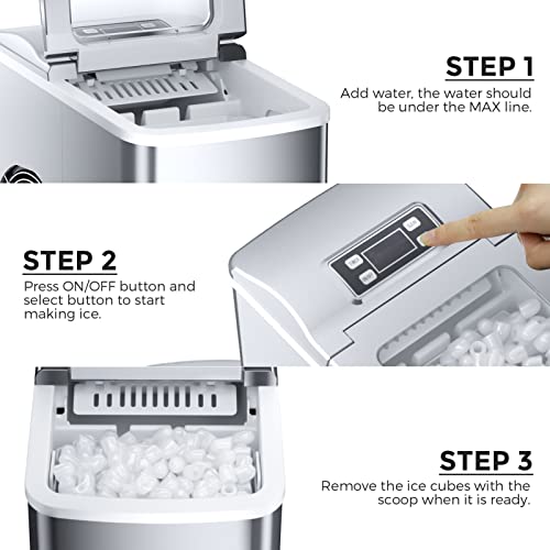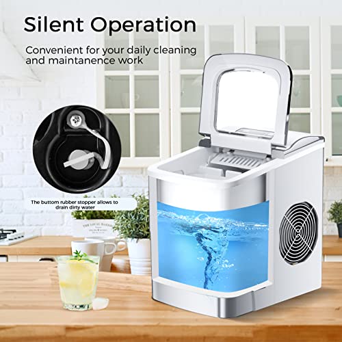 Hohe Qualität & Selbstreinigung: Unsere eiswürfelbereiter ist tragbar und effizient mit einer Größe von 10,2 x 13,3 x 15 Preis und einem Gewicht von 7 kg. Drücken Sie die „CLEAN“-Taste für 3 Sekunden, um den Selbstreinigungsprozess zu starten. Nach 10 Minuten und dann hört es auf zu schinden, Sie können den kleinen Gummistopfen an der Unterseite öffnen und das schmutzige Wasser aus der Kabine abfließen lassen; Bei der Reinigung können Sie die Kabine mit einem weichen Baumwolltuch von Hand reinigen.