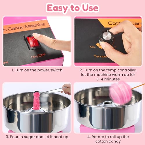 Einfache Bedienung & Reinigung – Die Herstellung von Zuckerwatte ist mit unserer Maschine kinderleicht. Schalten Sie sie ein, lassen Sie sie 3–4 Minuten aufheizen, geben Sie Zucker hinzu, und beobachten Sie, wie sie fluffige Zuckerwatte produziert. Der Zuckerauslass fasst etwa 115 g Zucker, sodass kein häufiges Nachfüllen nötig ist. Die Maschine lässt sich zerlegen, und die Edelstahlschüssel ermöglicht eine einfache Reinigung
