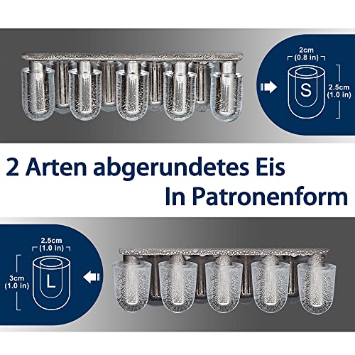 PATRONENFÖRMIGES EIS: Durch das transparente Fenster können Sie den Ausguss der Eisherstellung für klare Eiswürfel in der Eiswürfelmaschine beobachten und den Moment miterleben, wenn die Eiswürfel gefrieren. Die Eiswürfel in zylindrischer Patronenform sind hübsch und schön, was Ihnen eine ästhetische Erfahrung bringt, die gewöhnliche Eismaschinen nicht bieten können.