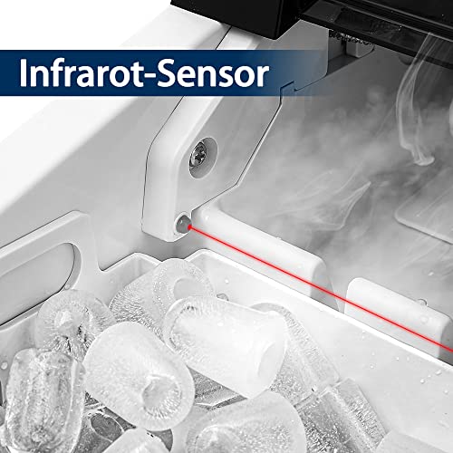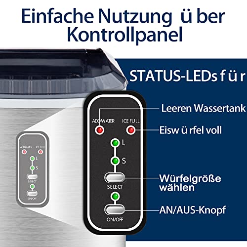 KONTROLL-PANEL :Euhomys eiswürfelbereiter hat zwei optionale Eiswürfelgrößen, sodass Sie zwischen verschiedene Größen von Eiswürfeln nach Ihren Bedürfnissen koordinieren können. Der Eisbereiter verfügt über die fortschrittlichste Infrarot-Sensortechnologie. Wenn der Eiskorb des Eisbereiters trunken ist, stoppt der die Eisproduktion, um ein Überlaufen der Eiswürfel zu umgehen. Wenn der Wasserstand im Wassertank nicht ausreicht, erinnert Sie die Kontrollleuchte daran, rechtzeitig Wasser nachzufüllen.