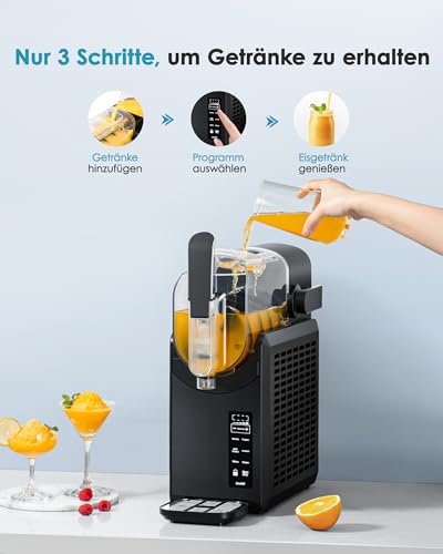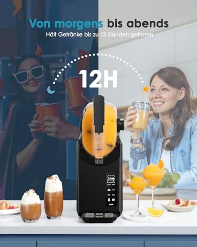 EINFACHE BEDIENUNG & SCHNELLGEFRIERTECHNOLOGIE: Die slush maschine von EUHOMY verfügt über einen effizienten Turbolader und ein benutzerfreundliches LED-Display. Drücken Sie einfach das Programm für gefrorene Getränke und warten Sie 15–60 Minuten auf einen köstlichen gefrorenen Smoothie. Die gefrorenen Getränke aus dem slush maschine sind bis zu 12 Stunden haltbar, sodass Sie sie jederzeit problemlos genießen können. Bietet Ihnen maximalen Komfort.