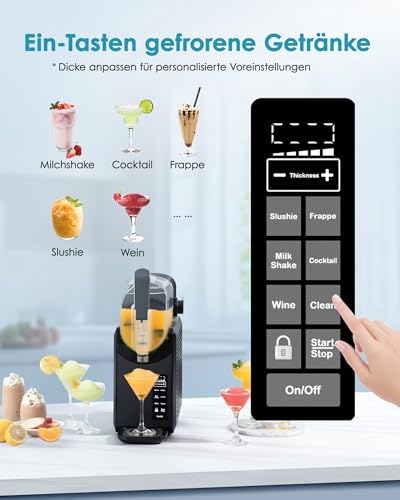 5 PROGRAMME & EINSTELLBARE SMOOTHIE-DICKE: Die EUHOMY Slush-Flieger bietet 5 voreingestellte Programme, darunter Slushie, Frappés, Milchshake, Cocktail und Wein. Das LED-Display der Margarita-Flieger zeigt die Temperatur in Echtzeit an, sodass Sie den Gefriervorgang sorgfältig überwachen können. Sie können die Einstellungen ganz einfach an Ihre bevorzugte Getränkedicke adaptieren, ob wohlbeleibt und cremig oder abgemergelt und erfrischend.