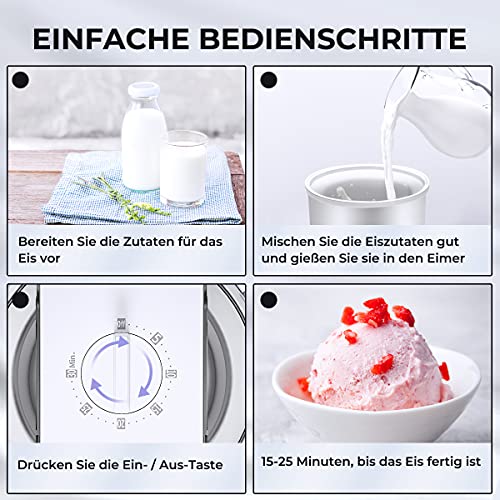 【Nachdenklicher Service】 – Um bessere Ergebnisse zu erzielen, frieren Sie bitte die Eiscreme-Zutaten ein, bevor Sie das Eis zubereiten. Bereiten Sie am besten ein Füllvolumen von nicht mehr als 550 ml vor. Wenn Sie Fragen haben, wenden Sie sich bitte allzeit an uns.