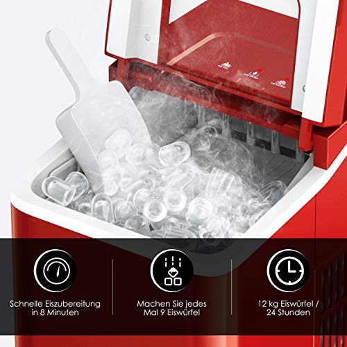 ❄️Effiziente & Schnelle Eis-Produktion: Dank dem 120 W Turbolader kann die Eismaschine 9 kugelförmige Eiswürfel in 8 Minuten und 12 kg Eis in 24 Stunden produzieren. Demgegenüber können Sie zu Hause jederzeit kalte Getränke genießen. Nachdem der Eiskorb(1,6L) voll ist, hört die Eiswürfelmaschine automatisch auf, Eis zu produzieren.