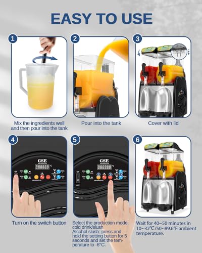 🍹【Sichere Kühlung】🍹 – Mit dem Slush- und Kaltgetränkemodus können Sie die Temperatur und Konsistenz einstellen, bis sie ideal ist. Lebensmittelgeeigneter Mixer mit Doppelspirale und Anti-Korrosions-Design, 360° Mixen. Der Tankdeckel mit LED-Licht und doppelt verdicktem, lebensmittelechtem, transparentem PC-Tankdesign ermöglicht es Ihnen, die Herstellung des gefrorenen Getränks jederzeit klar zu erkennen. Schalten Sie den Rührmodus ein, damit Sie Ihre Getränke über Nacht frisch halten können. GSE kommerzielle Margarita-Maschine bietet sicherere und gesündere Slush.