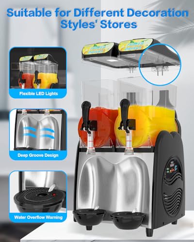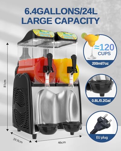 🍸【Kommerzielle Standards】🍸 – Mit einem Fassungsvermögen von 3,2*2 Gal serviert die Slush-Maschine etwa 58 Tassen (7oz/Tasse) köstliche Slushies und gefrorene Getränke für eine Party. Die 500W-Hochleistungsmaschine für gefrorene Getränke und der Mixer arbeiten schnell und effizient, um eine wünschenswerte Textur für gefrorene Getränke herzustellen. Die konstante Temperatur von 14°F~50°F ermöglicht die Zubereitung einer Vielzahl von alkoholischen und nicht-alkoholischen Getränken. Diese Margarita-Maschine ist perfekt für zu Hause, Geschäft, Bars usw.
