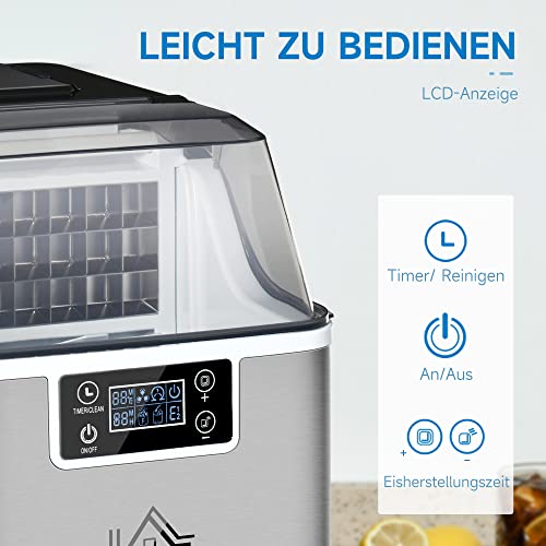 HOMCOM Eiswürfelmaschine, Ice Maker Edelstahl 24 Eiswürfel in 14-18 Min., 20kg/24h, 3,2L Wassertank, Selbstreinigend Eiswürfelbereiter mit 2 Arten der Wasserbefüllung, für Küche, Büro, Party, Silber