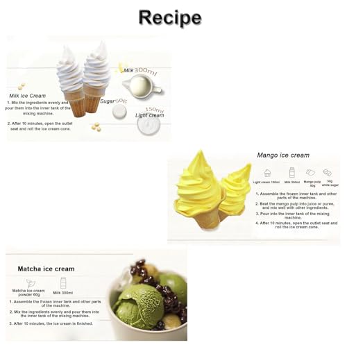 Einfach die Zutaten mischen, die Zutaten vorbereiten und in eine Schüssel geben und gut verrühren. Nach dem Hervorrufen der Softeismaschine die gemischten Zutaten in den gefrorenen Innenbehälter gießen. Etwa 10 Minuten lang umrühren, den Schalter Hervorrufen und das Eis rollen.