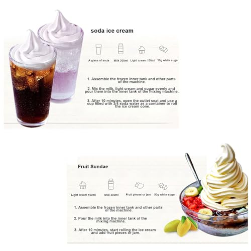 Einfach die Zutaten mischen, die Zutaten vorbereiten und in eine Schüssel geben und gut verrühren. Nach dem Einschalten der Softeismaschine die gemischten Zutaten in den gefrorenen Innenbehälter gießen. Etwa 10 Minuten lang umrühren, den Schalter einschalten und das Eis rollen.