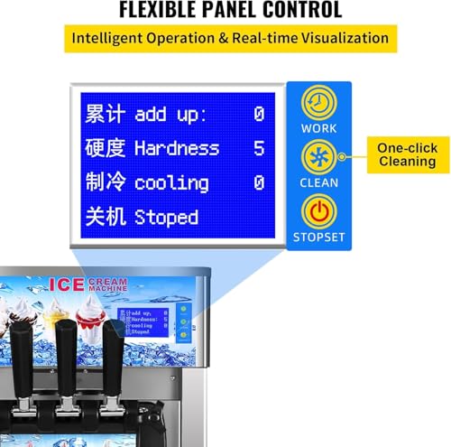 Benutzerfreundliche Schnittstelle: Ausgestattet mit einem LED-Bedienfeld vereinfacht diese Eismaschine den Betrieb. Integrierte automatische Abkühlung, Härteeinstellung, Ein-Klick-Reinigung und Timer-Einstellungen. Das Display bietet sofortige Updates zu Produktionszeit und -menge.
