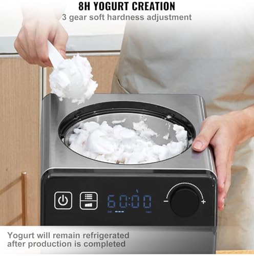 【LCD Display Steuerung und Timer】Mit 4 Modi und Kühlhaltefunktion. Eingebautes Handbuch, um Ihnen zu zeigen, wie man die Maschine benutzt. Fügen Sie einfach die Zutaten hinzu und schalten Sie es ein. Die gefrorene Joghurtmaschine zeigt die Zeit an und erledigt den Rest! Ein Signalton zeigt die Fertigstellung an. Durch den transparenten Deckel können Sie jederzeit den Produktionsstatus des Eises überprüfen. Fügen Sie zusätzliche Zutaten wie Nüsse, Schokoladensplitter, Früchte, etc. hinzu