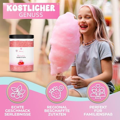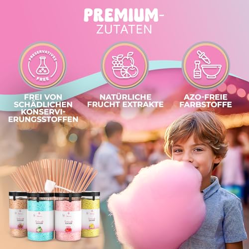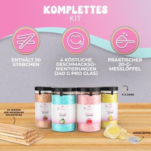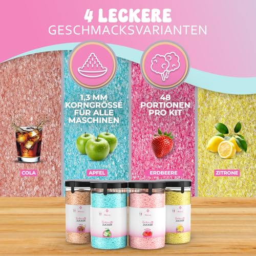 KOMPLETTES ZUCKERWATTE-SET; In diesem umfassenden Set von Misskandy sind 4 köstliche Zuckerwatte-Geschmacksrichtungen inbegriffen: Erdbeere, Zitrone, Apfel, und Cola; Freuen Sie sich auf Zuckerwatte-Zucker, der für die einfache Verwendung mit allen Zuckerwattemaschinen entwickelt wurde, sowie auf 50 Stäbchen und einen 20-g-Messlöffel.