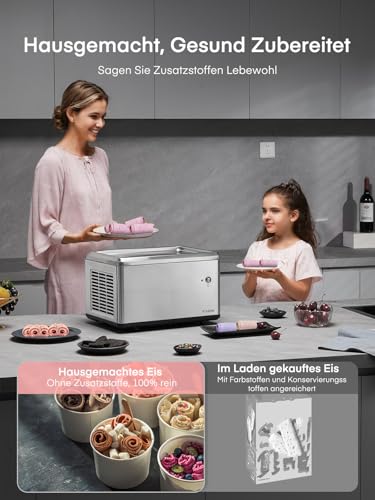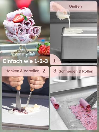 Selbstkühlende Roll-Eismaschine für Zuhause mit Kompressor, Soft Eis in nur 3 Mins, One-Touch Bedienung, Vielfältige Sortenwechsel, Gesunde Selbstgemachte Ice Cream Rolls, Rezept, 2 Spachteln, FOHERE