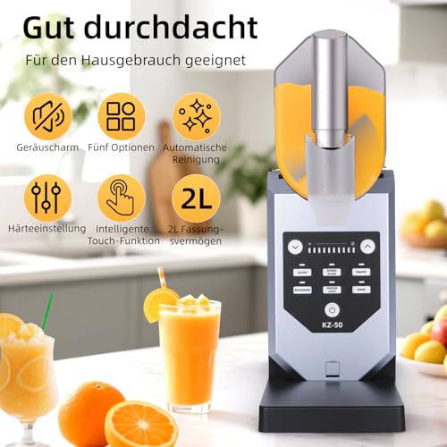 【Einfache Bedienung】Fünf professionelle Programme – mit dagegen einem Knopfdruck speziell für verschiedene Getränke (Cola, Hochprozentiges, Kaffee, Milchshakes, Säfte) entwickelt. Intelligente Veränderung der optimalen Konsistenz und Rührzeit für eine Vielfalt von professionell zubereiteten Slush- und Eiscréme-Kreationen. (Hinweis: Der Zuckergehalt muss ≥5% betragen, um die ideale Slush-Textur zu erreichen; der Alkoholgehalt sollte zwischen 3-16% liegen, da höhere Werte das Gefrieren abwenden.)