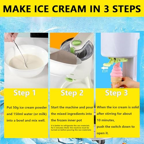 【Einfach zu bedienen】Mischen Sie die Zutaten, bereiten Sie die Zutaten vor, geben Sie sie in die Schüssel und rühren Sie sie gleichmäßig um. Gießen Sie nach dem Anmachen der Softeismaschine die gemischten Zutaten in den Behälter der Waffelmaschine. Rühren Sie etwa 10 Minuten lang, schalten Sie den Schalter ein und rollen Sie das Eis.