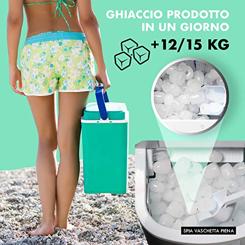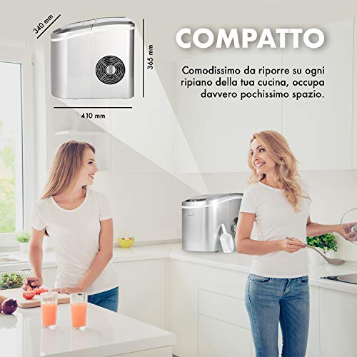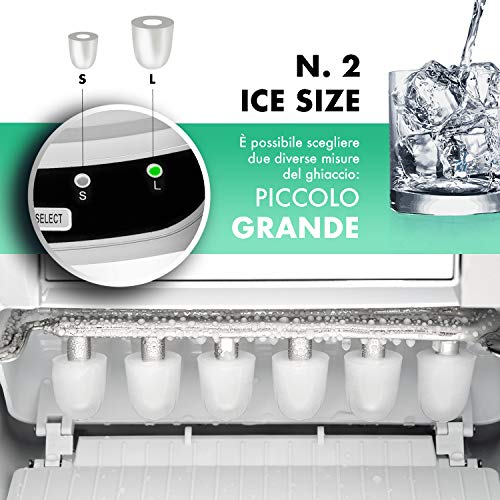 Eigenschaften: Hocheffizienter Abgasturbolader, FCC, frei, Maße: 34 x 41 x 36,5 cm – Nettogewicht: 7,8 kg. – 2 Eisgrößen: klein und groß – Eisspeicherkapazität: 600 g – tägliche Eisproduktionskapazität: 12/15 kg in 24 Stunden – Fassungsvermögen Wassertank: 2 Liter
