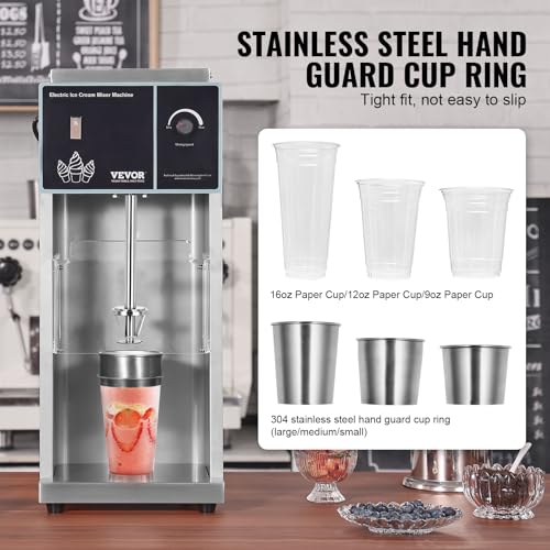 Benutzerfreundliches Design: Enthält einen Becherring jeder lebensmittelechtem Edelstahl 304, der perfekt auf Pappbecher mit konischem oberen und unteren Durchmesser passt und indes des Mixens einen sicheren Halt ohne Abrutschen bietet. Drei Becherringgrößen entsprechen drei Handbechergrößen (9/12/16 oz). Ein Spritzschutz jeder transparentem PC verhindert effektiv das Verspritzen von Eiscreme und Zutaten. Vier Gummifüße an der Unterseite sehen nach sicheren Stand.