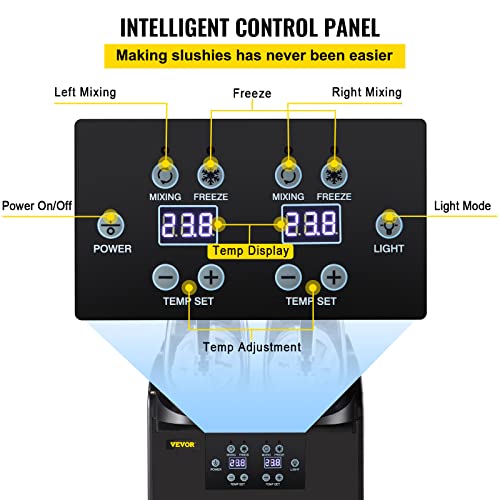 Präziser Steuerbereich: Die Maschine ist mit einem kurzen Bedienfeld ausgestattet. Jede Schüssel arbeitet unabhängig und kann ein-/ausgeschaltet oder zwischen Gefrier- und Mischmodus umgeschaltet werden. Mit der Konservierungsfunktion können Sie die Temperatur von 3 bis 2 Grad einstellen, um die Slusheis frisch zu halten. Sie können das Bedienfeld nach Ihren Bedürfnissen verwenden.