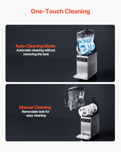 Langlebig & leicht zu reinigen: Diese kommerzielle Slush-Maschine mit Edelstahlgehäuse und lebensmittelechtem PC-Tank ist langlebig und leicht zu reinigen. Der Tank verfügt über eine automatische Ein-Knopf-Reinigung und die modularen Komponenten können für eine problemlose Wartung und Reinigung einfach und ohne Werkzeug auseinandergenommen werden.
