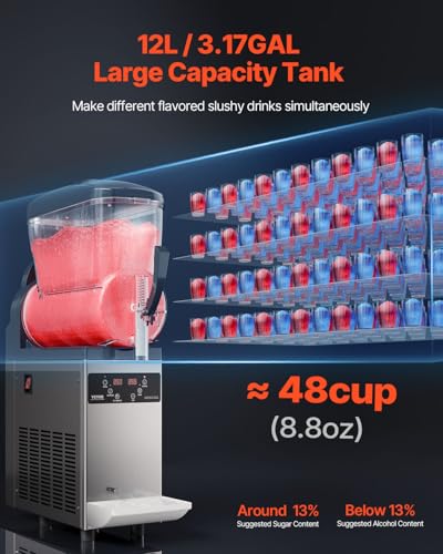 12-Liter-Einzeltank: Mit einem Tank mit 3,17 Gal (12 L) Fassungsvermögen kann diese Slush-Maschine ungefähr 48 Tassen Slush-Getränke pro Charge herstellen. Sie muss weniger häufig nachgefüllt werden, was sie perfekt für den gewerblichen Einsatz mit hohem Verkehrsaufkommen macht. Der transparente Tank präsentiert farbenfrohe Getränke wunderschön und eignet sich daher hervorragend für Eisdielen, Burger-Läden, Cafés, Bars und andere gewerbliche Einrichtungen.