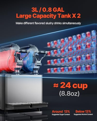 Zwei 3-Liter-Tanks: Diese Mini-Slush-Maschine verfügt über zwei Tanks mit jeweils 3 Litern Fassungsvermögen und kann pro Charge etwa 24 Tassen Slush-Getränke produzieren (empfohlener Zuckergehalt: ca. 13 %, Alkoholgehalt: unter 13 %). Der transparente Tank präsentiert Ihre farbenfrohen Getränke wunderschön und eignet sich daher perfekt für Eisdielen, Burger-Läden, Cafés, Bars und andere gewerbliche Einrichtungen.