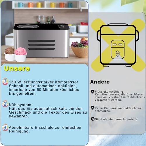 【Eismaschine ohne Vorgefrieren】Die Eismaschine mit einem Fassungsvermögen von 2 Litern ist mit einem hochwertigen Abgasturbolader ausgestattet, der für eine effiziente und schnelle Abkühlung sorgt und das Vorgefrieren der Schale wie bei herkömmlichen Eismaschinen überflüssig macht. Der leistungsstarke 150-Watt-Motor treibt den Mixer an, der schnell und kontinuierlich mischt und Eis mit einer feinen Textur herstellt. Mit der Vpcok Direct Eismaschine können Sie in im Unterschied dazu 60 Minuten reichlich gesunde und schmackhafte Eiscreme für Ihre Familie zubereiten