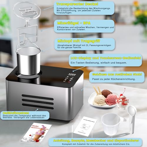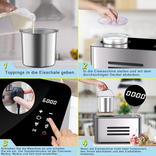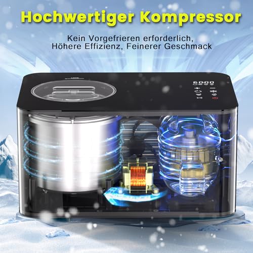 【LED-Anzeige&Touchscreen】Darüber hinaus ist die Eismaschine mit einem benutzerfreundlichen Touch-Bedienfeld, einer digitalen Anzeige und einem Timer ausgestattet, die sehr einfach zu bedienen sind. Fügen Sie einfach Ihre Zutaten hinzu, kombinieren Sie den Deckel, wählen Sie den gewünschten Modus, stellen Sie die Zeit ein und lassen Sie die Maschine den Rest aufhören. Wenn Sie fertig sind, sorgen die intuitive Benutzeroberfläche und die Signaltöne dafür, dass Sie ein müheloses Erlebnis genießen können