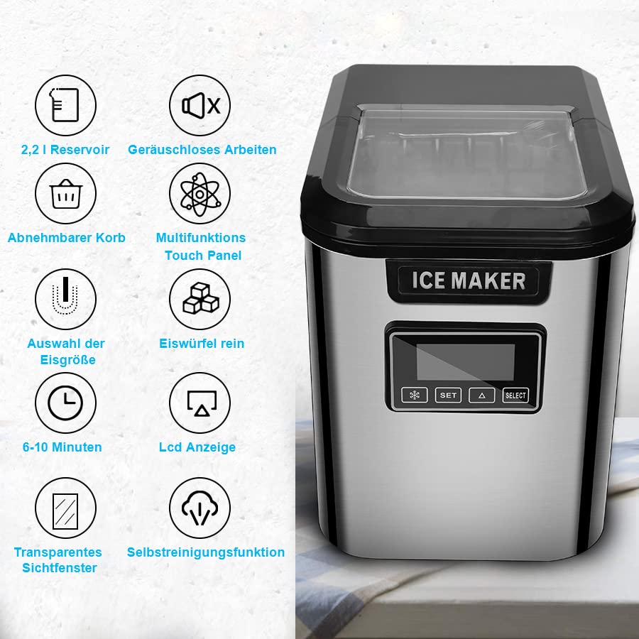 ❄【Einfach zu bedienen & Timer】Bedient wird der Eiswürfelbereiter über 4 Tasten direkt unter dem Display. Sie müssen nur den 2.2L Wassertank mit Wasser füllen, Klicken Sie dann auf die Schaltfläche Start. Hier lässt sich auch der Ein-/Ausschalt-Timer programmieren. Die Maschine verfügt außerdem über zusätzliche Funktionen wie Wassermangelalarm, vollständiger Eisalarm und Fehlermeldung.