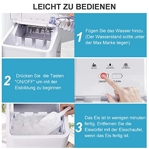 🧊【SCHNELLE EISERZEUGUNG】 Wasser in Wassertank (1.5L) einschütteln, transparenten Deckel schließen und dann ICE MAKING drücken. Jedes Mal 9 Stück Eiswürfel in 8 Minuten (das erste Mal kann ein paar Minuten langsamer sein) hergestellt. Damit können Sie rund um die Uhr 12 kg Eis bekommen und ganztägig Erfrischungen für Ihre Party anbieten.